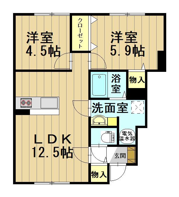 | 間取り | 2LDK(LDK12.5 洋4.5 洋5.9) |